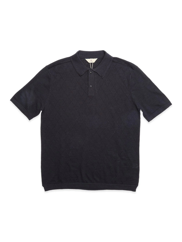 Die Vorderseite überzeugt mit einem raffinierten Diamant-Strickmuster, das dem Polo Tiefe und Struktur verleiht. Ärmel und Rückenteil sind bewusst in glattem Strick gehalten und schaffen einen dezenten Kontrast, der dem Design eine klare, moderne Linie gibt.